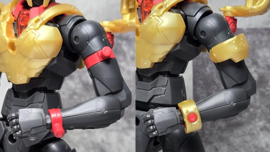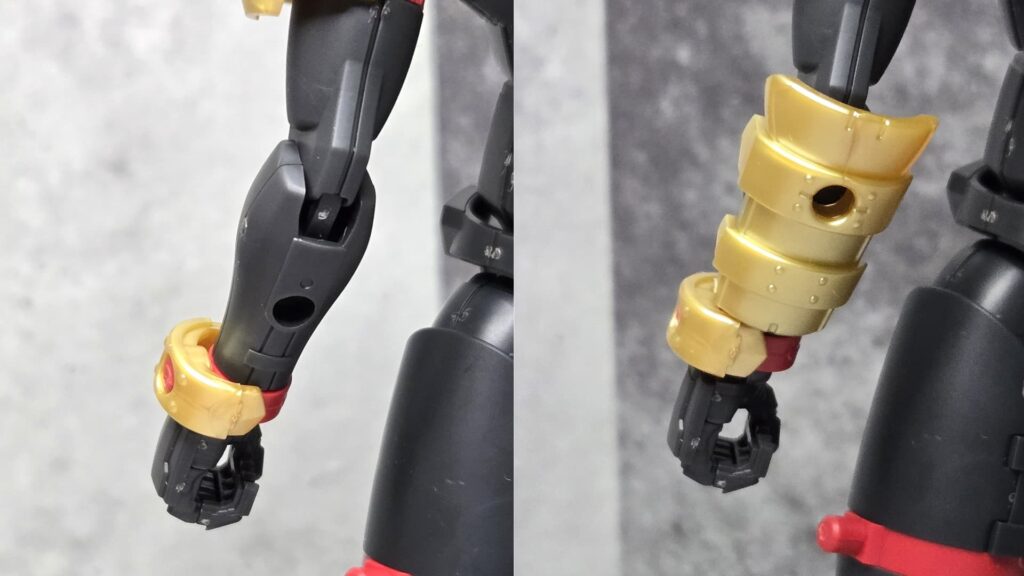 続いてアームパーツの換装です。コチラの装着ポイントは3点ありまして、まずは肩リング、手首リングにそれぞれ装甲を装備していきます。