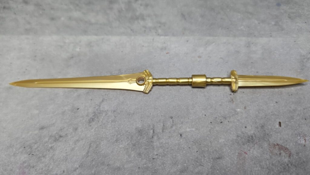説明書の使い方としては、片手剣と短剣をくっつけて両刃剣にして使う遊び方が提示されているね。それぞれ長さが違う刃をどう使うのかな…?