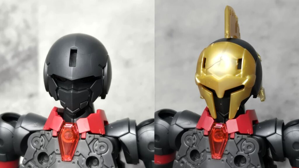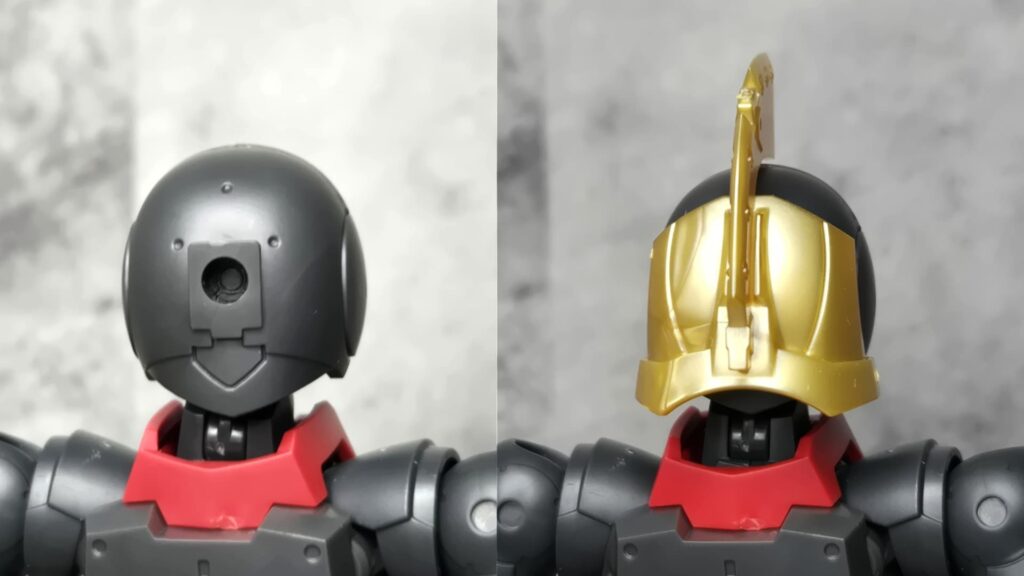 ではまずヘッドパーツから。こちらは後頭部は3ミリピン形式、フェイスガードは額のマイナスピンでそれぞれポン付けするだけで換装完了!マスクの差し替えがないのですぐ素体とソードマンの状態を入れ替えられるのもいいですね。