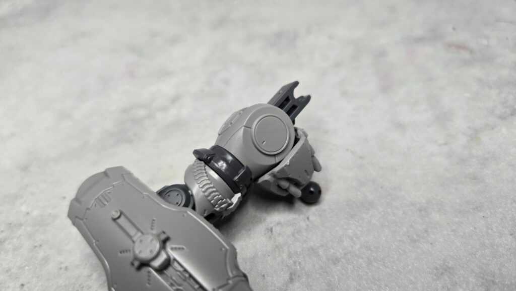 アームのその他の要素ですが…肩周りはこんな感じで、本体との接続は30MMオリジナルの方と同じサイズのボールジョイントを使用しています。このアーム側のボールジョイント基部やボディのボール受けどちらにも可動ジョイントは仕込まれていないので、肩周りの可動域は残念ながらあまり良くはないみたいです。