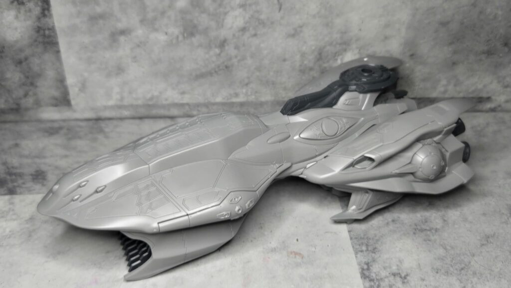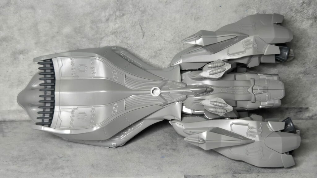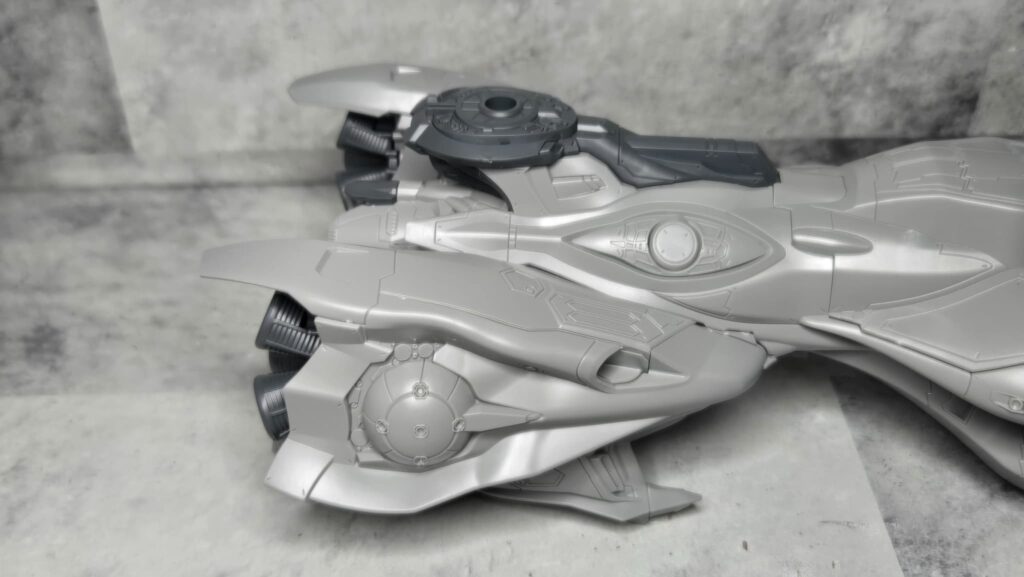 ですねぇ…実際好きな色で塗装するだけでも宇宙用軍艦のプラモとしてまるっと使えそうなフォルムをしてますし、あとはウイングや各種艦載兵器をちょいちょい持ってあげれば、案外ガンダムの主役陣営側の艦みたいな感じにも仕立て上げられそうですね。