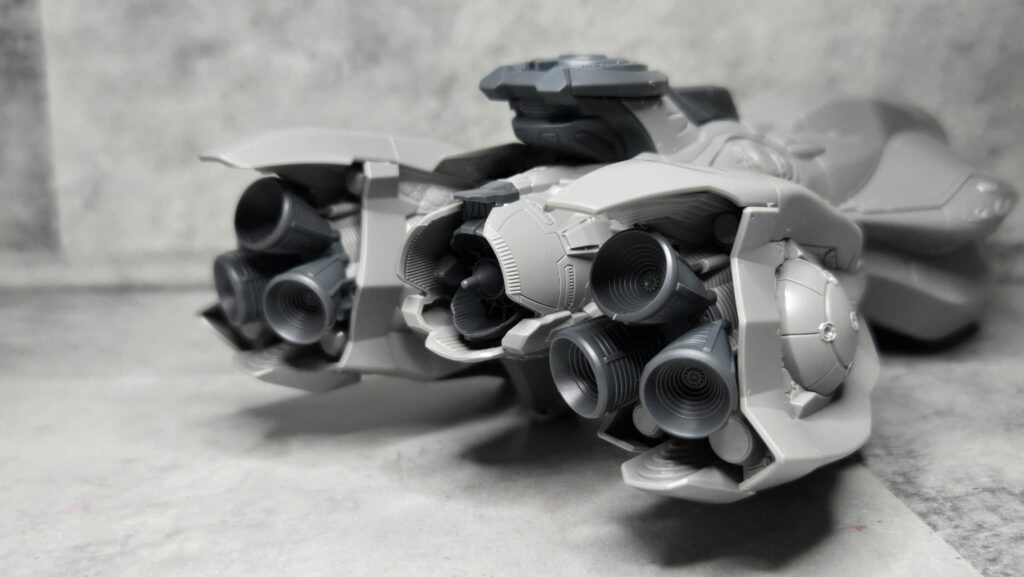 後方には3ユニットのどでかいバーニアが用意されています。真ん中のメインと見られるものは本体直結型、左右の3つバーニアが付いているユニットはこれで1セットとなりまして、ボールジョイントで本体とユニットを相互につなぎあわせるように接続するので、外付けユニットとは思えないレベルの強固な接続実現しています。