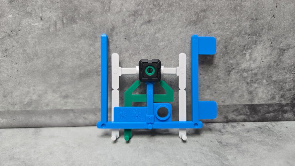 前輪周りを見ていこう!さっそくキューブジョイントにパーツを装着していくんだけど、このパーツは計器類などを表示する部位っぽい造形をしていて結構かっこいいんだよね!