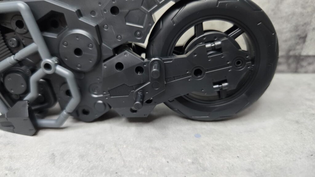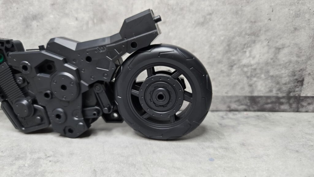 続いて後輪周りを見ていきましょう。こちらはブレイブバイクと同じく装甲っぽいパーツにタイヤ装着用のクランクジョイントを取り付けたら…