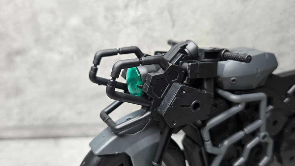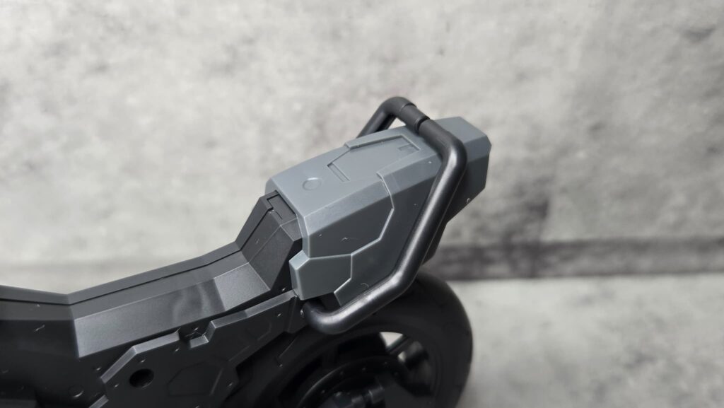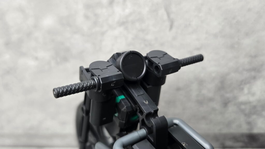 ちなみに反対側…上部に来る方にはサイドにグリップをセットすることでバイクのハンドルにすることが可能。バイク風プラモとしても一気にそれっぽい雰囲気になりましたし、実際にプラモを乗せる際にもこのグリップをつかませることで固定することができるわけですね。