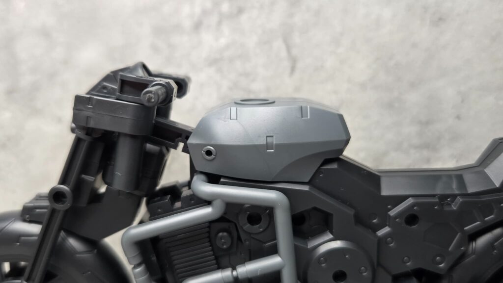 最後に本体上部のパーツを盛っていきましょう!まずはこちら、実際のバイクならガソリンなどエネルギー源を入れているタンクのようなものですね。接続方式はフレームにあるCジョイントに3ミリジョイントを併用するガッチリした組み合わせとなっています。