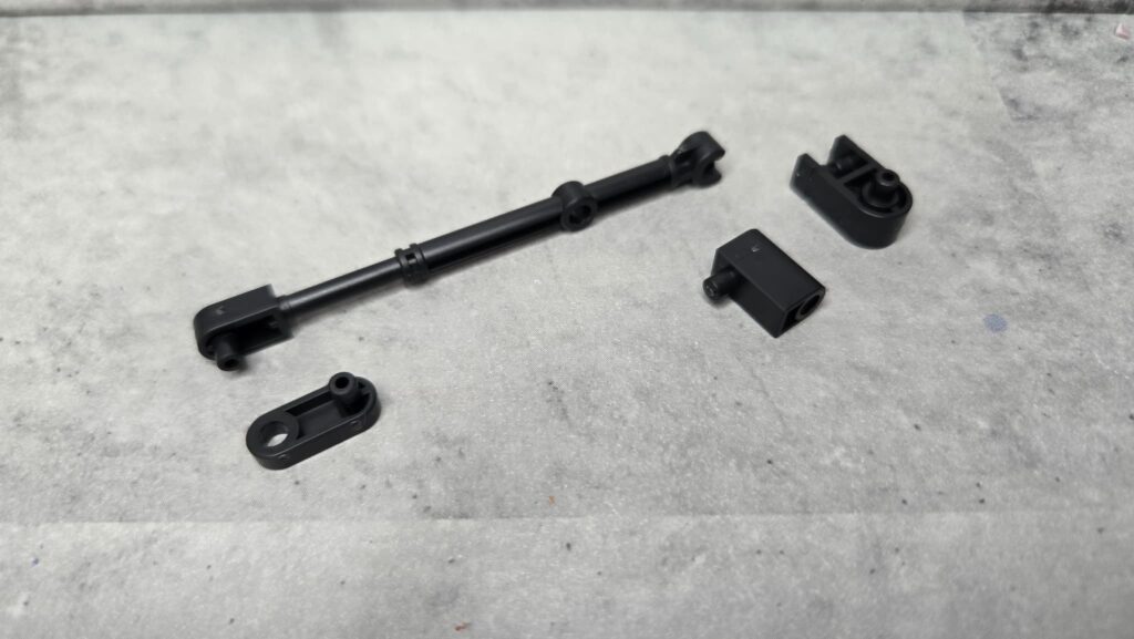 続いて長い棒状のジョイントに片側3ミリピン、片側3ミリ穴のジョイントなどのパーツを組み合わせたものを用意しましたら、クランク風のパーツのほうにタイヤを設置し本体に組み合わせることで、もう前輪がセットできてしまいます!