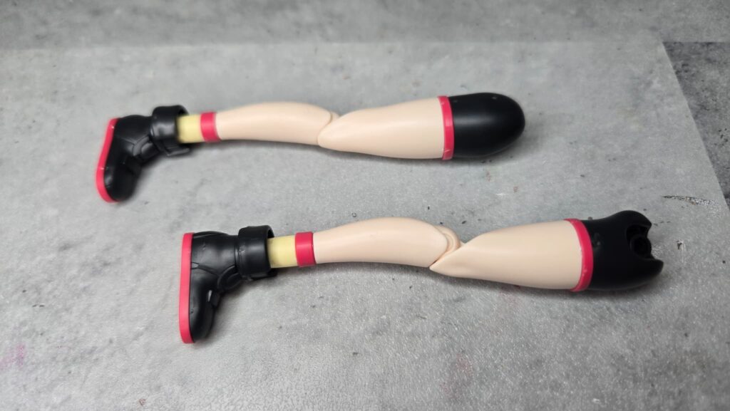 このリングはそのままでも赤い差し色として機能しますが、ほか部位と同じくピン付きのものに差し替えることで拡張機能として利用できるようになっています。またリングと靴の間部分はうすいイエローの成形色となり靴下のような表現にも使えそうです。