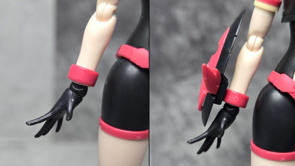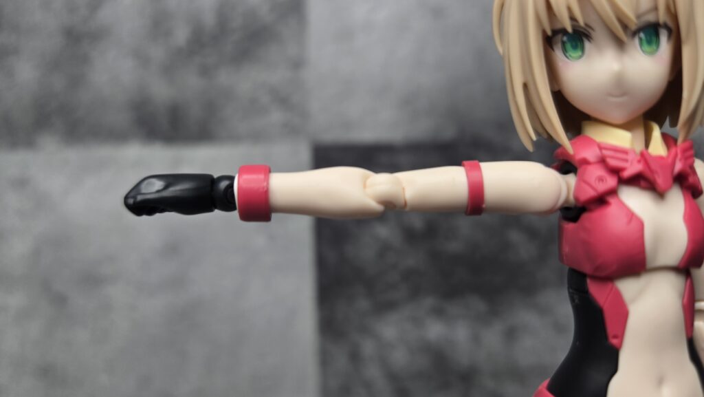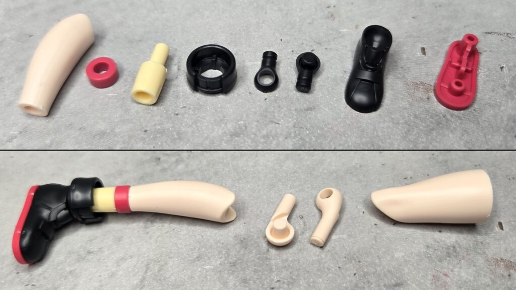 これは肌色版にも使える機能ですが、今回はレッド成形のリングに加えうすいイエロー成形のリングを追加で装着するようになっています。これによってアームパーツを少し長く見せられることに加え、ワンポイントで新カラーが入ることで見た目の目立ちやすさが上がるのが面白いところです。