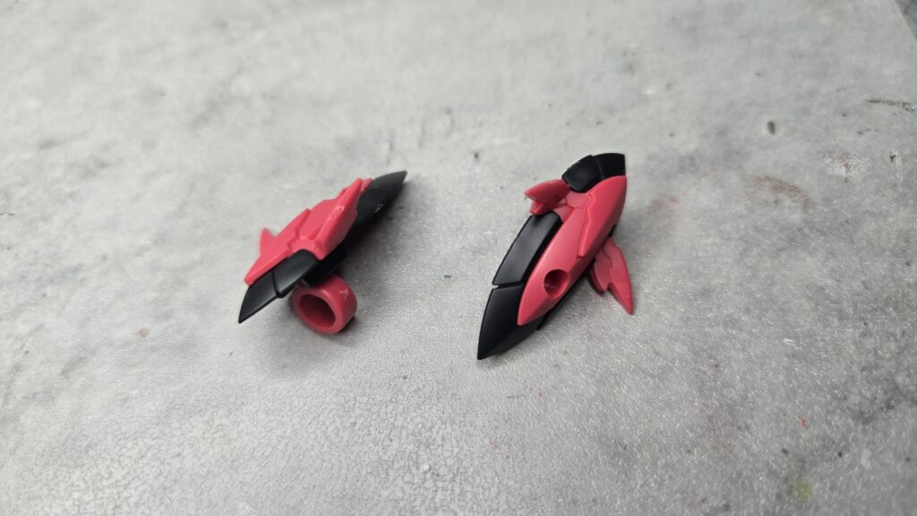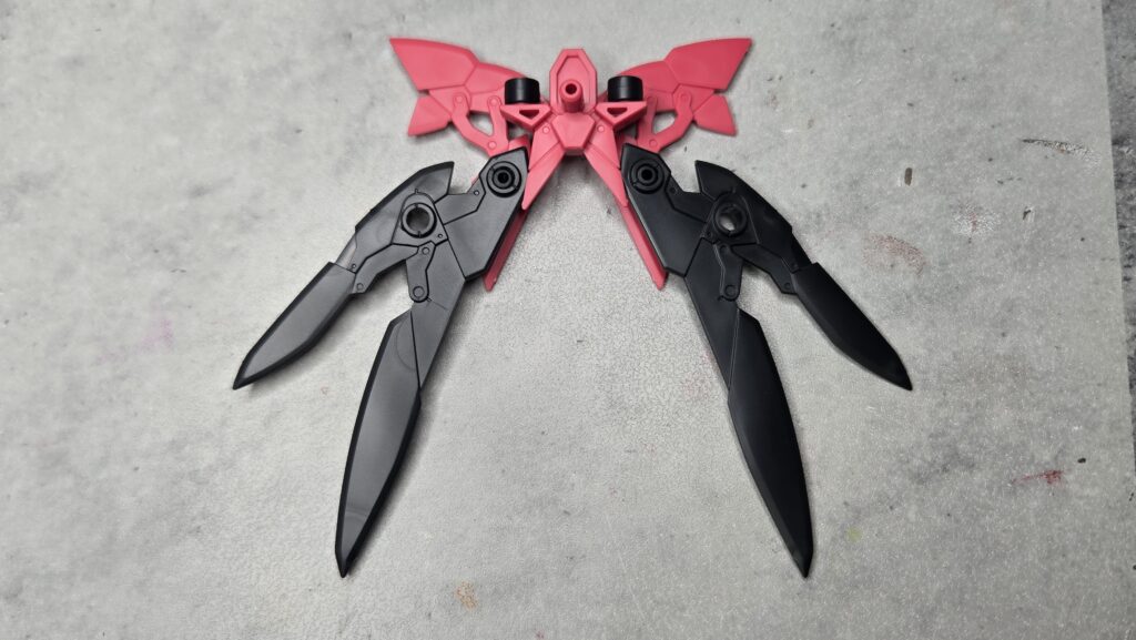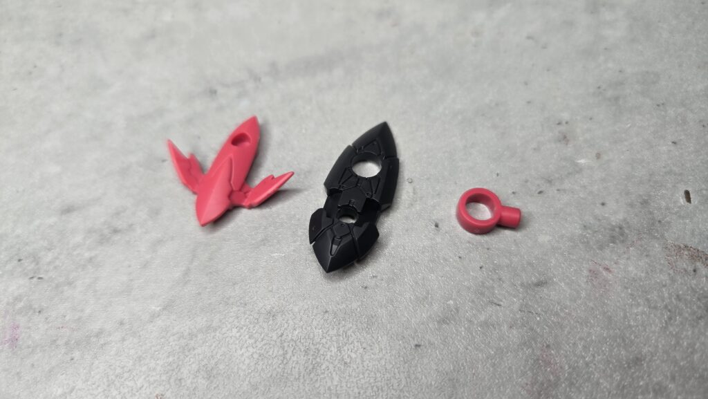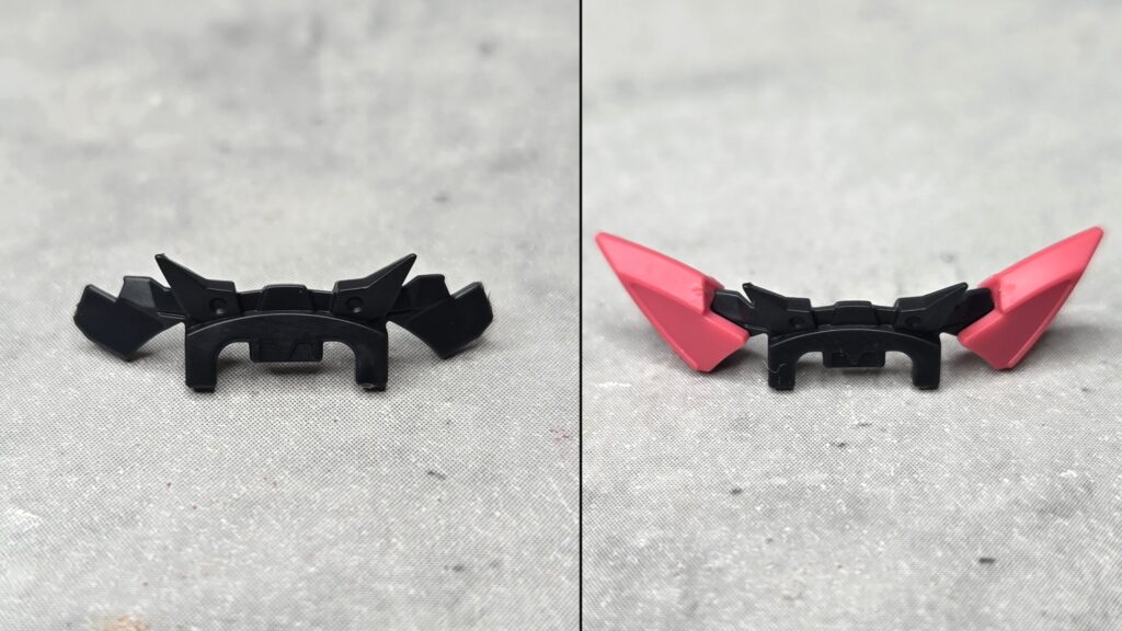 遠目に見るとウイングというよりリボンのようにも見える構成になっていますので、ブラック成形の部分も一緒にいっそ濃いレッドで塗りつぶしてしまってもかなりいい感じになりそう。