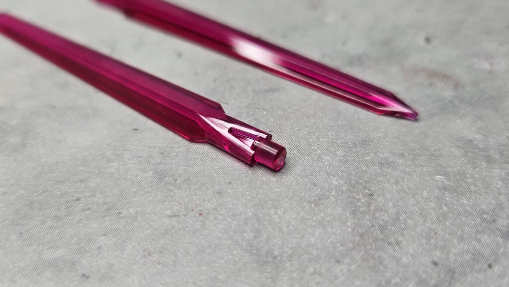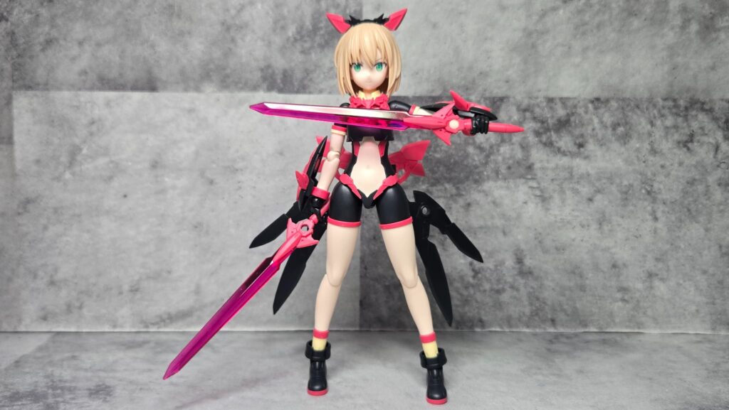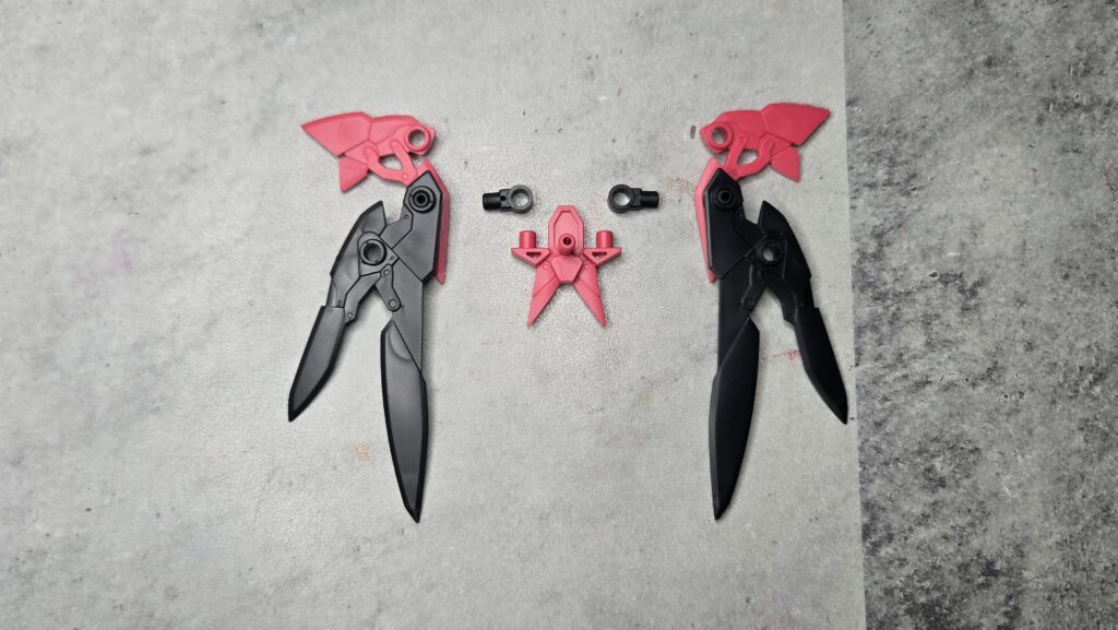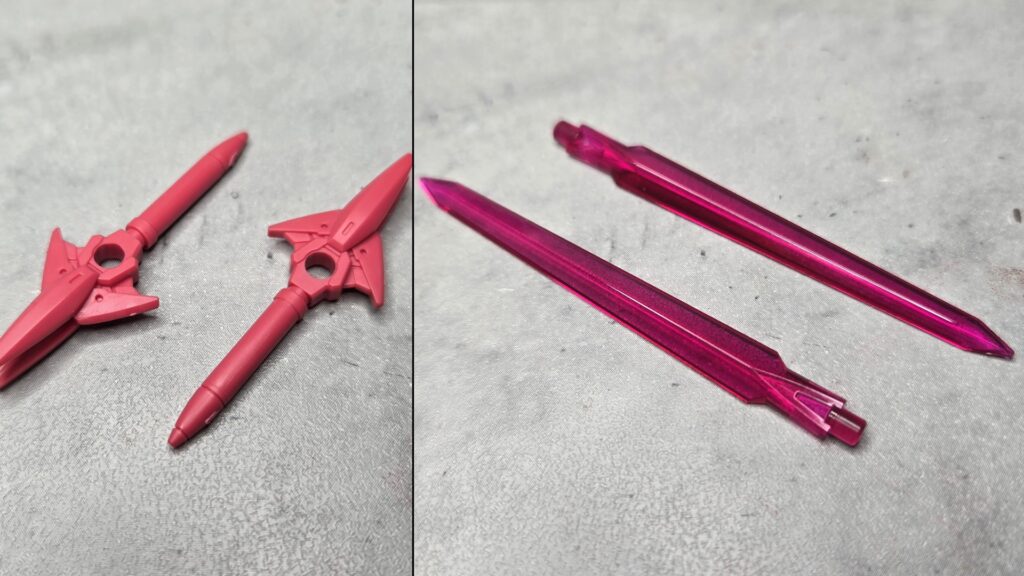 そして出来上がるのがこちら、ティアーシャのイメージカラーといっても差支えがなさそうなちょっと薄めのレッドの基部に、ガンダムのビームサーベルなど様々なプラモに使用されるクリアレッドを成形色とした剣2本となります!