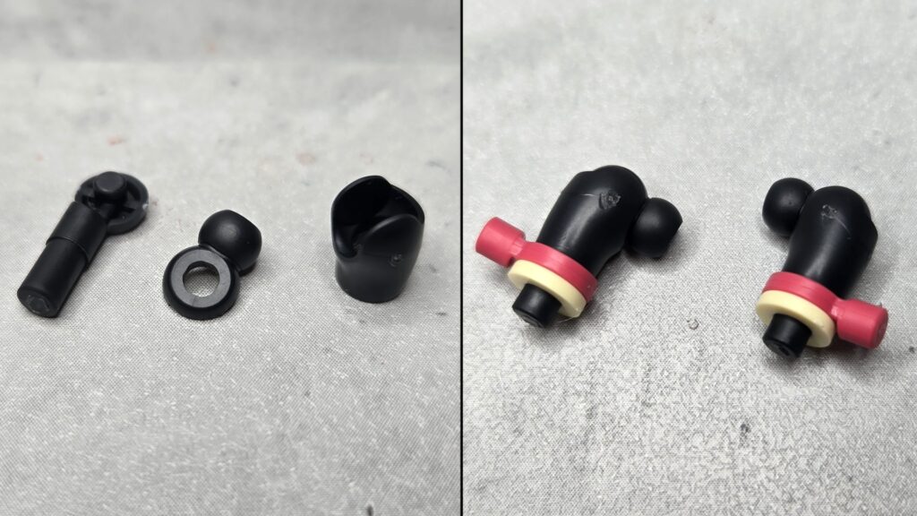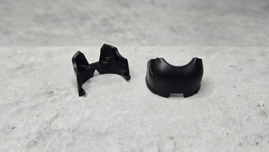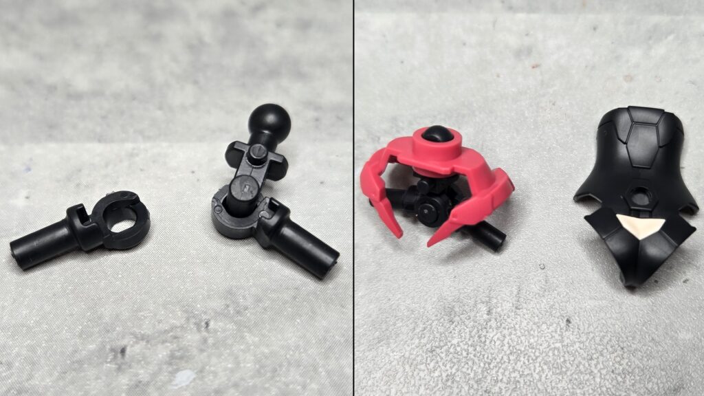アームパーツを見ていきましょう。ベースとなるのはブラック成形に変わった肩まわりで、組み方も機能も肌色版と全く同じとなっています。