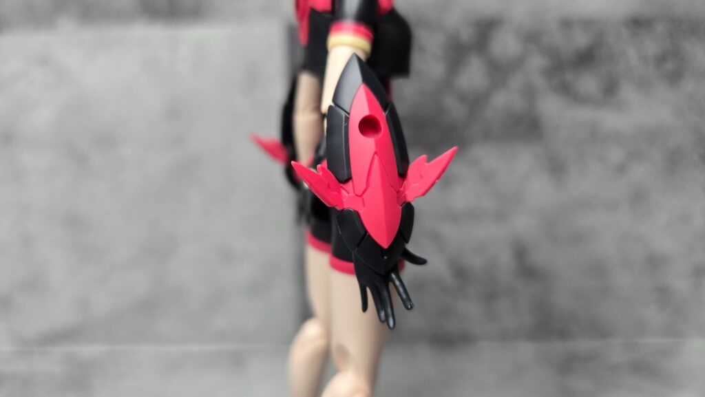 またガントレット側面のレッド成形パーツにも3ミリ穴があけられているんで、ここを使って何かしらカスタムや装飾の追加を行うこともできるかも?
