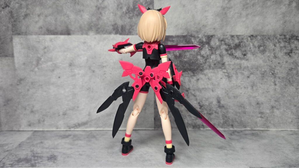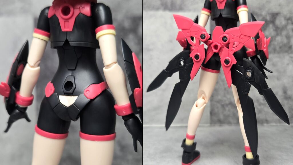 説明書通りに組むなら腰に接続するようになっているね。こうするとなおさらリボンのように見えてくるぞ…!見た目的にはアルファシスターファンタズムに近い感じの雰囲気になるのかな?