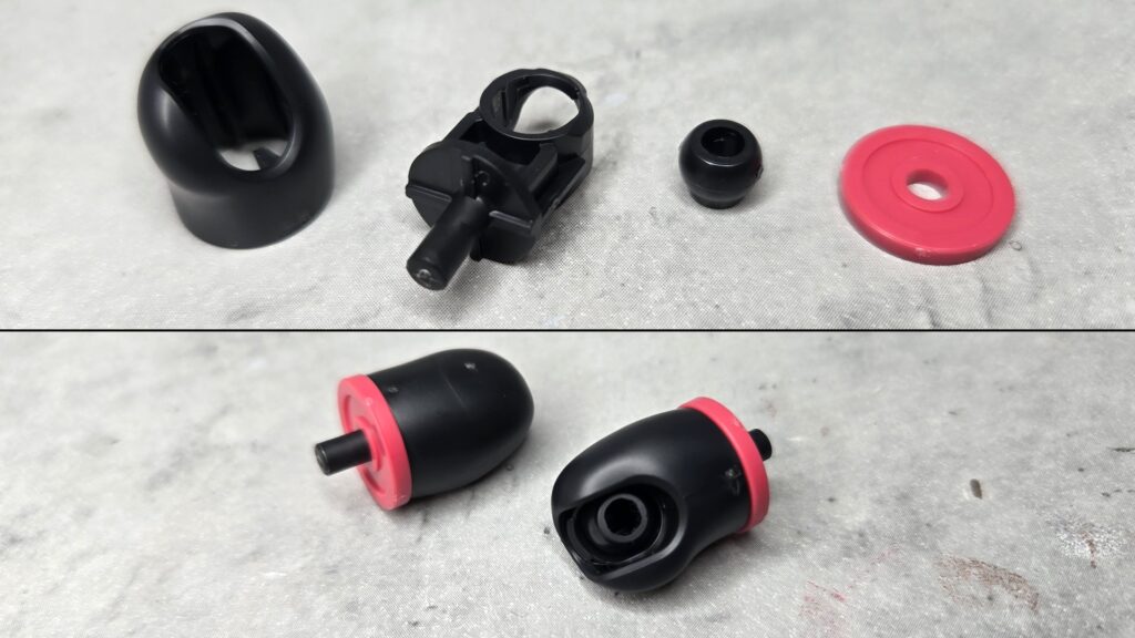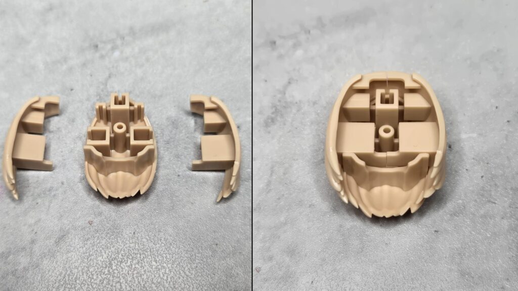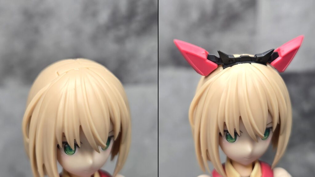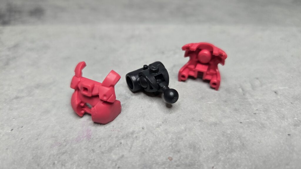 これはブラックのベースパーツの上部左右サイドに赤い耳のような装飾を取り付ける形式になっているよ。
