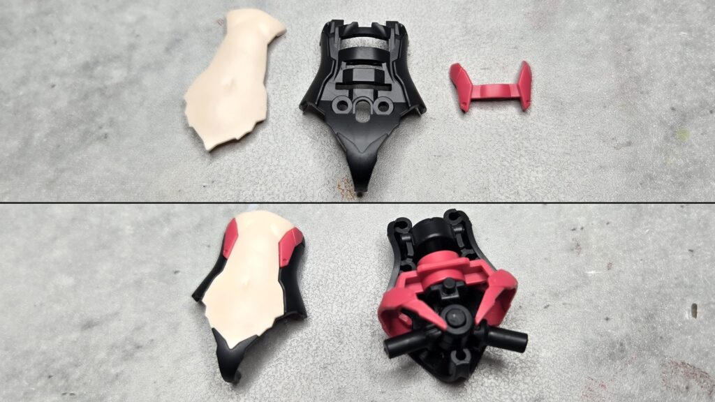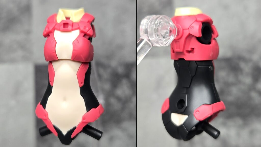 背中の3ミリ穴下部の空きスペースとソケットに背面パーツ、続いてそこに胸部パーツを装着することで、黒い外装を施すことができるのです!