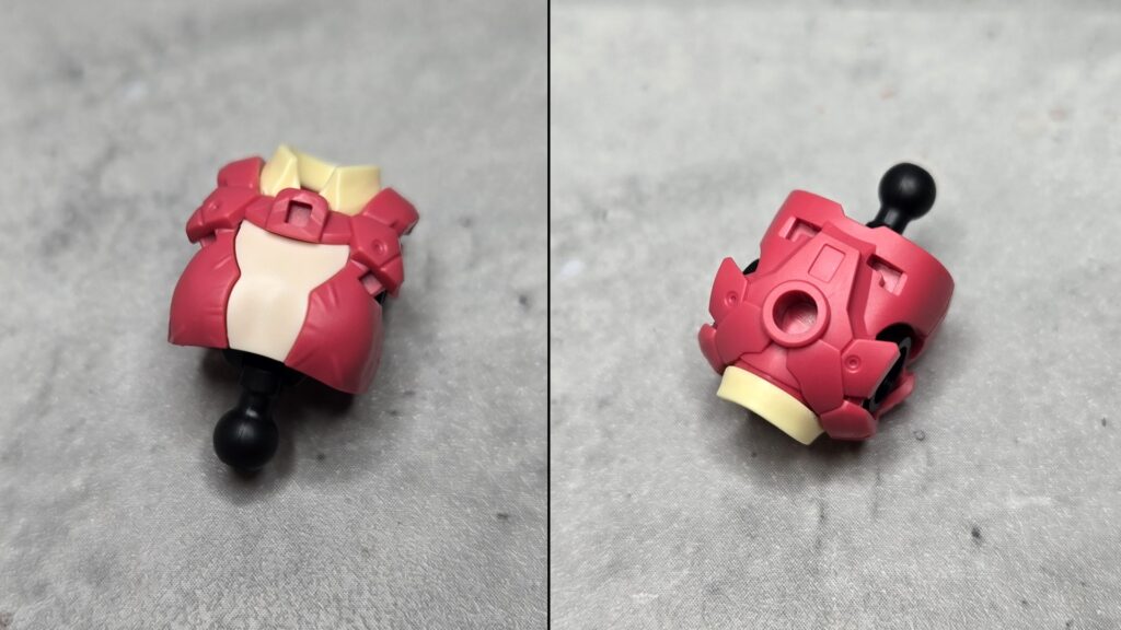 腹部パーツも基本的なつくりは同じで、上部で胸部との接続、下腹部内に上下に動く3ミリピンをセットしレッグパーツを装着しつつ、レッグ全体の可動を担う…という形式になっています。